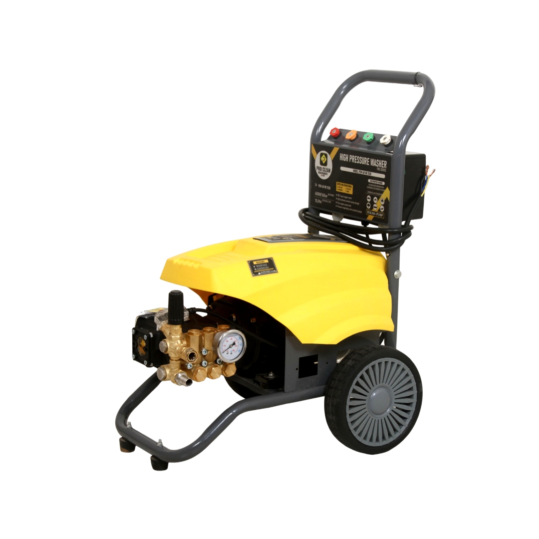 The RR1520 High Pressure Water Pump delivers 160 BAR pressure with a 5 HP 3-phase motor running at 1440 RPM, ensuring high-efficiency performance. With a 15 LPM flow rate, it is ideal for industrial and commercial cleaning. This pump includes a high-pressure gun, four nozzle options (0°, 15°, 25°, and 40° degree), and a 10-meter high-pressure hydraulic hose (R1 3/8) with QRC and sleeve. A 2-meter suction hose, suction filter, and stainer enhance reliability, while the auto cut-off and manual running system ensure operational control. Optional accessories include a Pro Clean Foam Gun, 1.2-meter long lance, and Italian QRC & Sleeve.