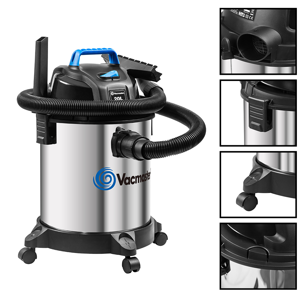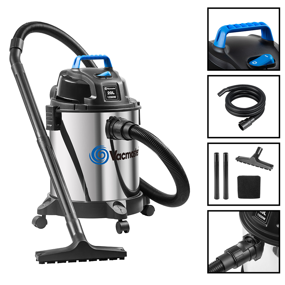 The MASTER OF HOMES VOC1220SW is a powerful 1250W wet and dry vacuum cleaner with a durable 20L stainless steel tank. It features a Vacmaster in-house motor, 18 kPa suction, and a 3-meter uncrushable hose. Designed for convenience, it includes a top handle for tool storage, large drainage port, and easy-glide wheels tested for over 30,000 hours. With a PTFE pre-filter system and blower function, it's perfect for efficient, all-purpose cleaning.